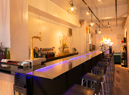 ガラス張りの特注カウンターと、足元をやさしく照らすLEDライトが印象的なBarプライベート。